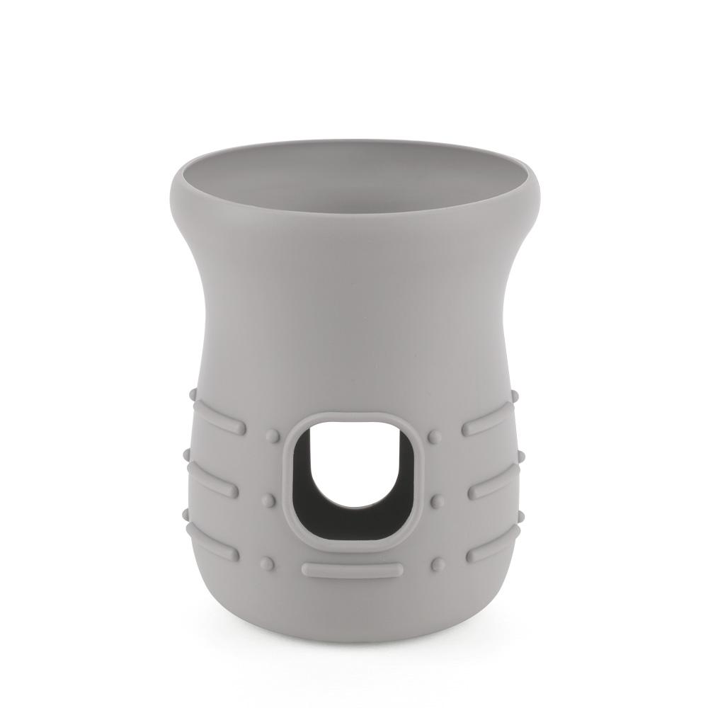 The cover slides securely over compatible glass bottles, creating a textured outer layer that helps reduce slipping during feeding or milk preparation. The raised edges provide additional grip points, while the open window ensures volume markings remain easy to read. The silicone material is designed to withstand temperature changes and is suitable for both microwave and dishwasher use.