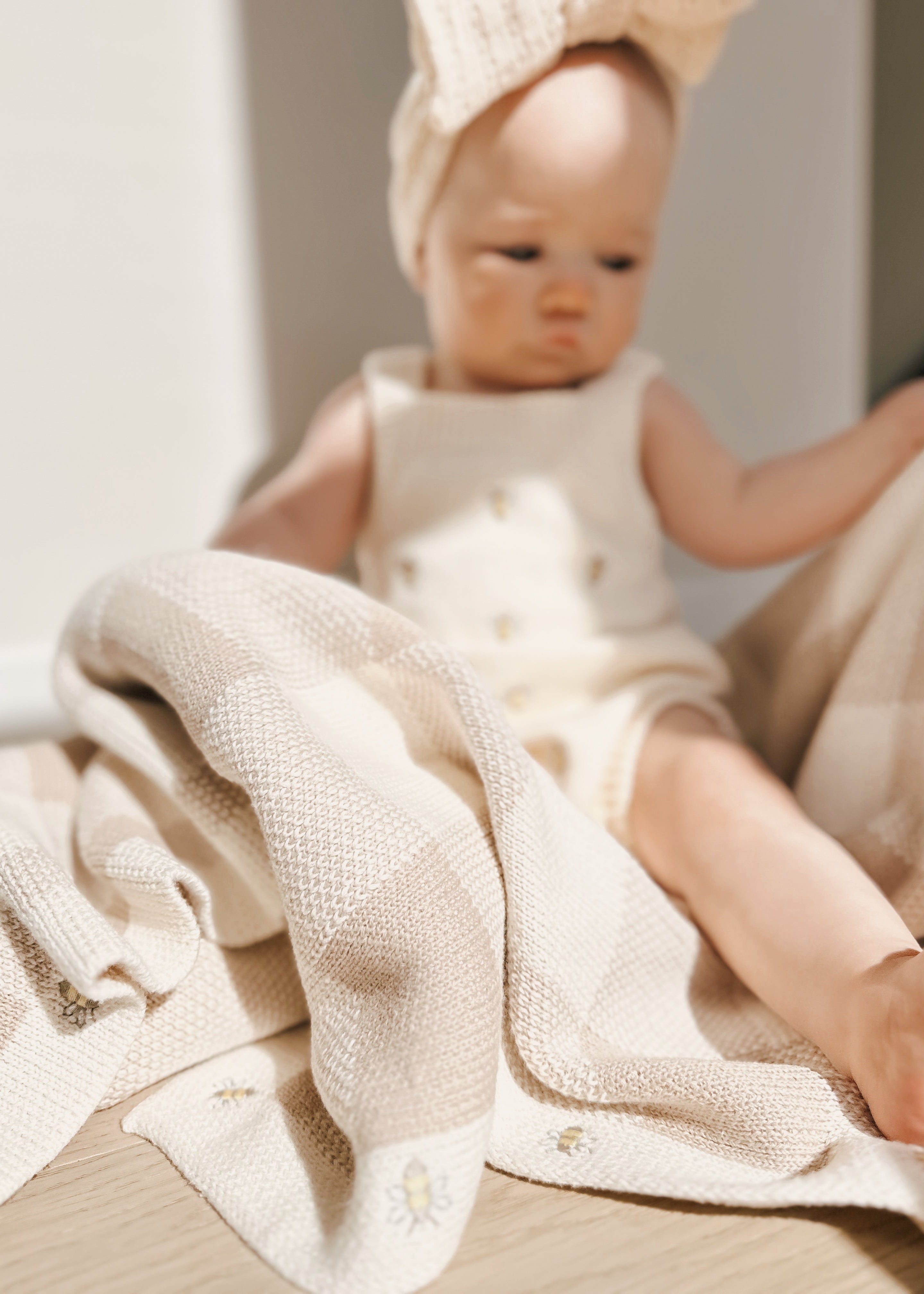 Inspired by sunny picnics in the grass, our Gingham Busy Bee Organic Baby Blanket brings a classic look to everyday comfort. The soft cream and tan gingham knit makes this blanket beautifully neutral—perfect for any outfit, nursery, or season. Along the trim, you’ll find delicately embroidered bumble bees, adding a sweet, whimsical touch your little one will adore.