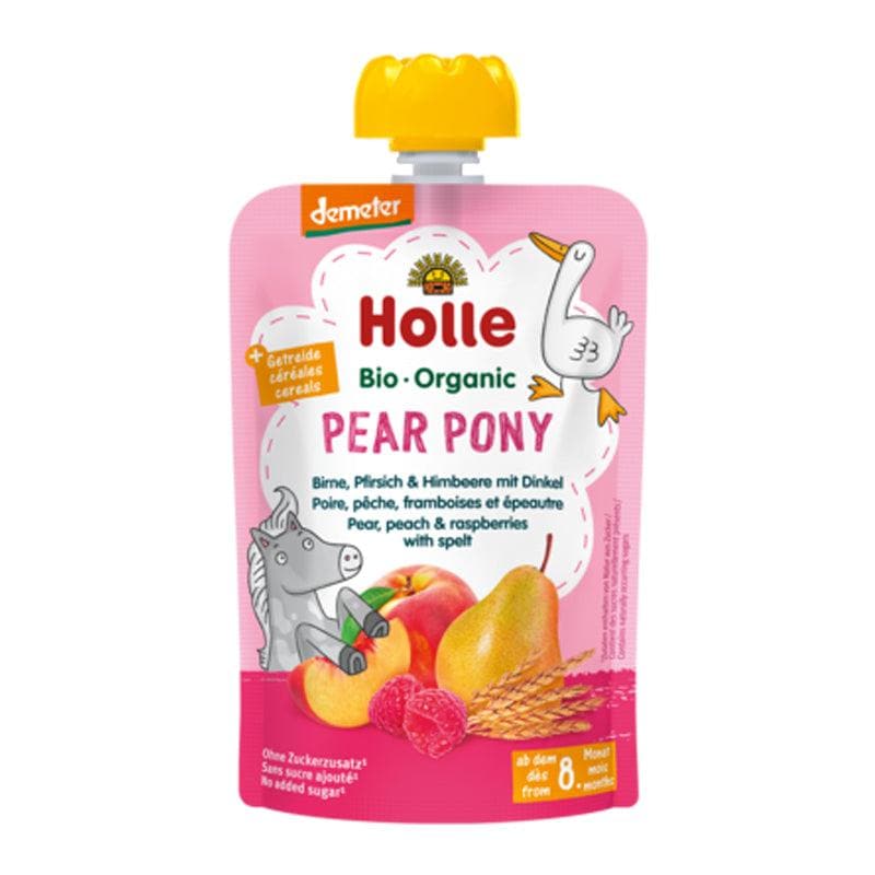 Introduce your little one to the wholesome taste of organic fruits with Holle Pear Pony Organic Fruit & Spelt Pouch. This delicious baby snack combines pear, peach, raspberries, and organic spelt wheat to create a naturally sweet and balanced puree perfect for babies and toddlers.