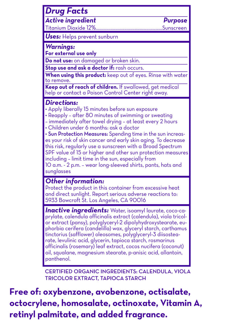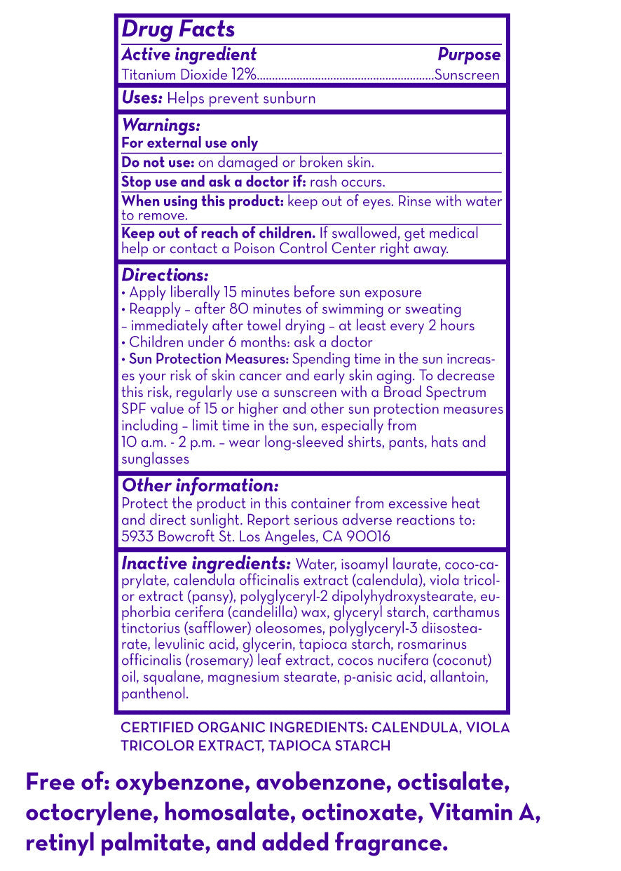 Titanium Dioxide (Active Mineral Sunscreen), Plant-Based Emollients, Gentle Skin Conditioners.